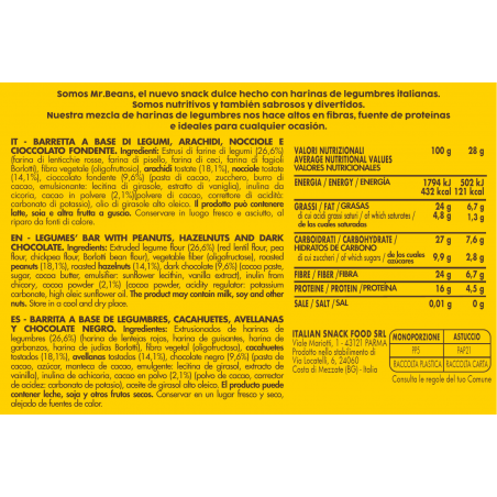 Ingredientes: Extrusiones de harinas de legumbres mixtas (harina de lentejas rojas, harina de guisantes, harina de garbanzos, harina de judías borloto), fibra vegetal (fructooligosacárido), cacahuetes tostados, avellanas tostadas, chocolate negro 60% (pasta de cacao, azúcar, manteca de cacao, emulgente: lecitina de girasol, extracto de vainilla), inulina de achicoria, cacao en polvo (cacao en polvo, regulador de acidez: carbonato de potasio), aceite de girasol alto oleico.