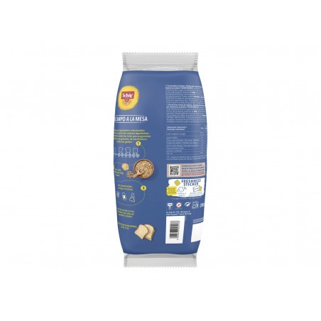 Ingredientes: almidón de maíz, agua, masa madre 16% (harina de arroz, agua), almidón de arroz, fibra vegetal (psyllium), jarabe de arroz, aceite de girasol, proteína de soja, harina de mijo 1,9%, espesante: hidroxipropilmetilcelulosa; harina de quinoa 1,3%, levadura 1%, fibra de patata, fibra de bambu, miel, sal yodada (sal, yoduro de potasio). Puede contener trazas de altramuz y mostaza. SIN TRIGO. SIN LACTOSA.