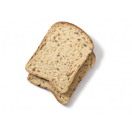 Ingredientes: almidón de maíz, agua, masa madre 14% (harina de arroz, agua), almidón de arroz, fibra vegetal (psyllium), jarabe de arroz, aceite de girasol, copos de soja, semillas de girasol 2,1%, harina de mijo 2%, semillas de lino 1,9%, espesante: hidroxipropilmetilcelulosa; harina de quinoa 1,3%, levadura 1,3%, harina de arroz 1,3%, fibra de patata, fibra de bambu, proteína de soja, salvado de soja, sal yodada (sal, yoduro de potasio), semillas de amapola 0,6%, semillas de chía 0,6% (Salvia hispanica), miel. Puede contener trazas de altramuz, sésamo y mostaza. SIN TRIGO. SIN LACTOSA.